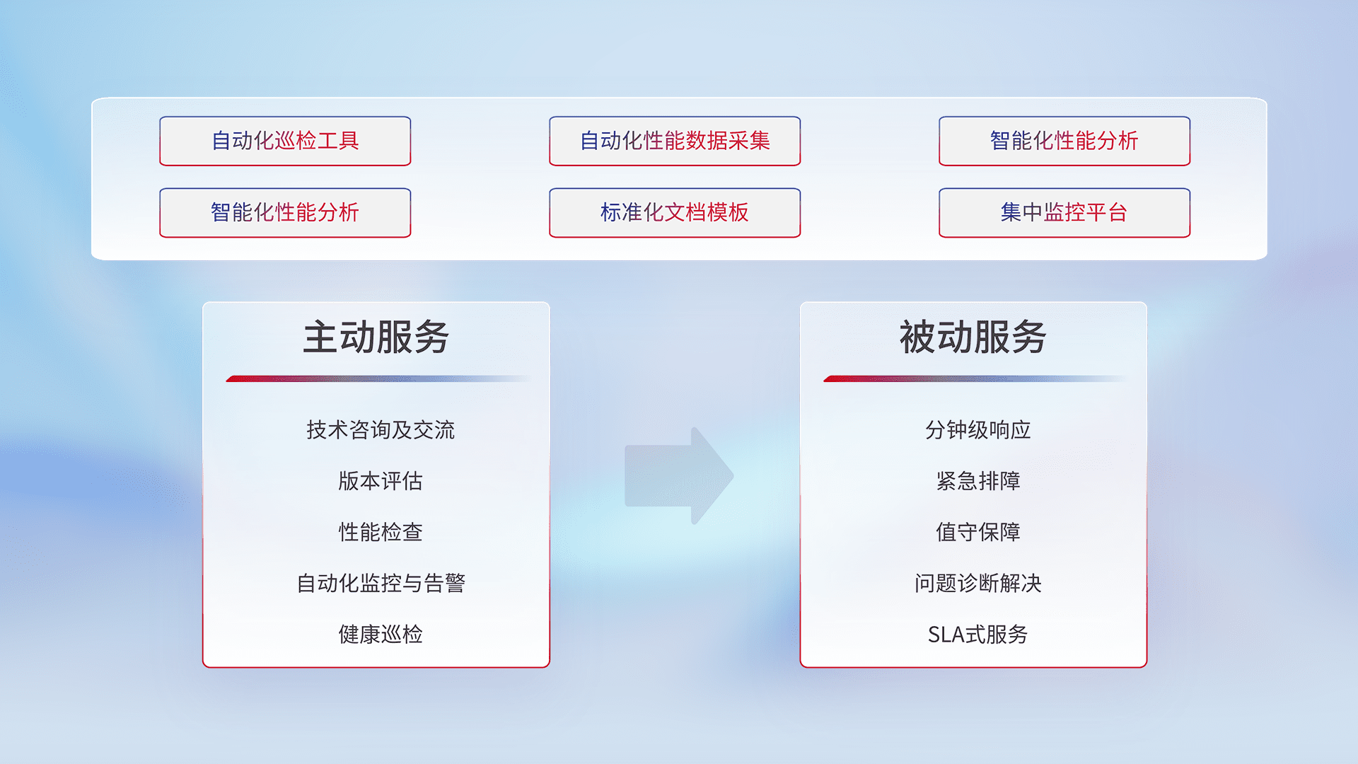 智能化工具和标准化文档,,,,保障服务质量,,提供主动服务(包含技术咨询、、版本评估、、性能检查、、、自动化监控与告警、、、健康巡检)和被动服务包含(分钟级响应、、、紧急排障、、、值守保障、、、问题诊断解决、、SLA服务)。。